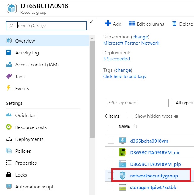 To do that, from the Azure Portal select the Resource Group of your Azure VM that hosts your Dynamics 365 Business Central sandbox and then select the Network Security Group: