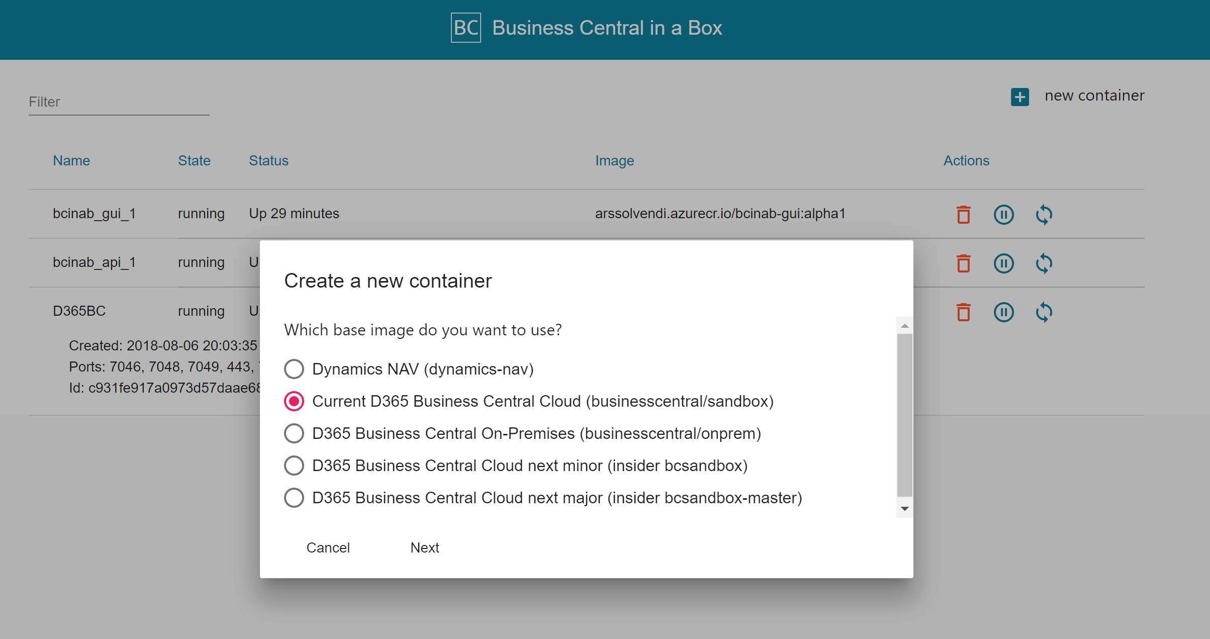 Business Central in a Box (BCinaB) is an interesting project developed by Tobias Fenster that permits you to have a web UI for creating new Dynamics 365 Business Central / Dynamics NAV containers (it consists of a Angular Material based frontend and a .NET Core webapi backend with an nginx reverse proxy).
