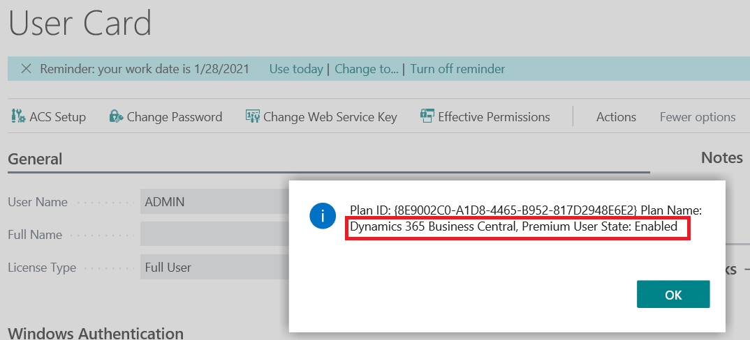 For showing how to do this with the version 15 release, I’ve created a small extension that adds an action to the User Card page and then calls a GetUserPlan method defined in a custom codeunit. The method is defined as follows: