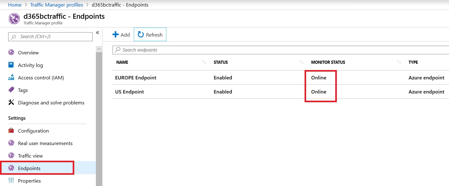 Now, if you select the created Azure Traffic Manager profile you can see the endpoints and check their status (the endpoint is working correctly if Monitor Status = Online):