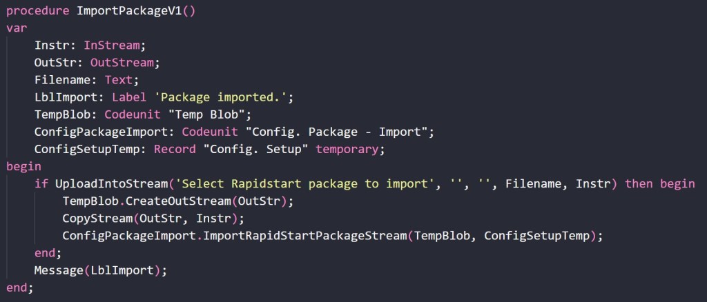 This code uses the ImportRapidStartPackageStream method declared in the “Config. Package – Import” codeunit as follows: