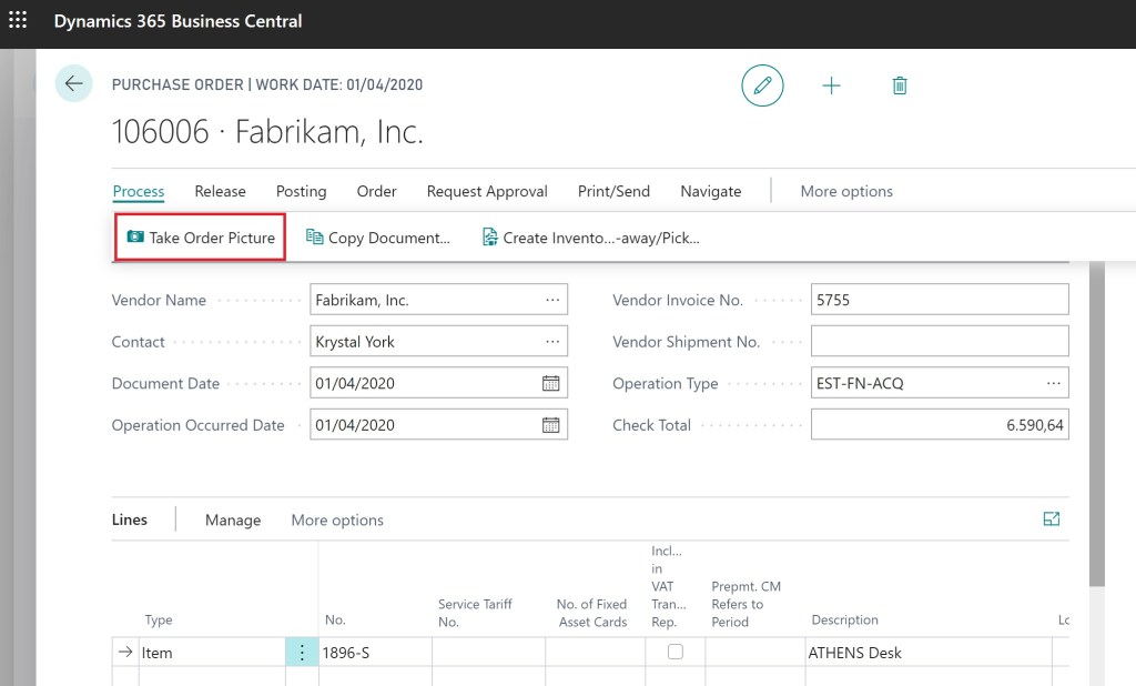 As an example, I have created a Take Order Picture action in the Purchase Order page for capturing the photo of a purchase order and attach it to the document card itself: