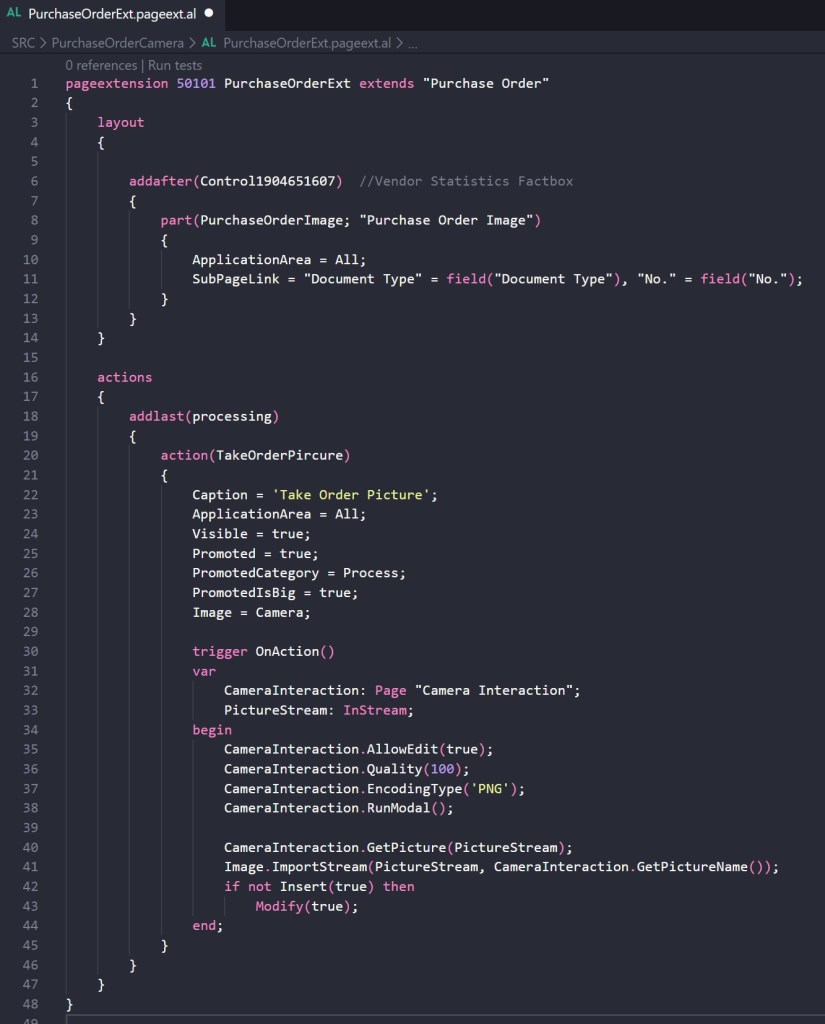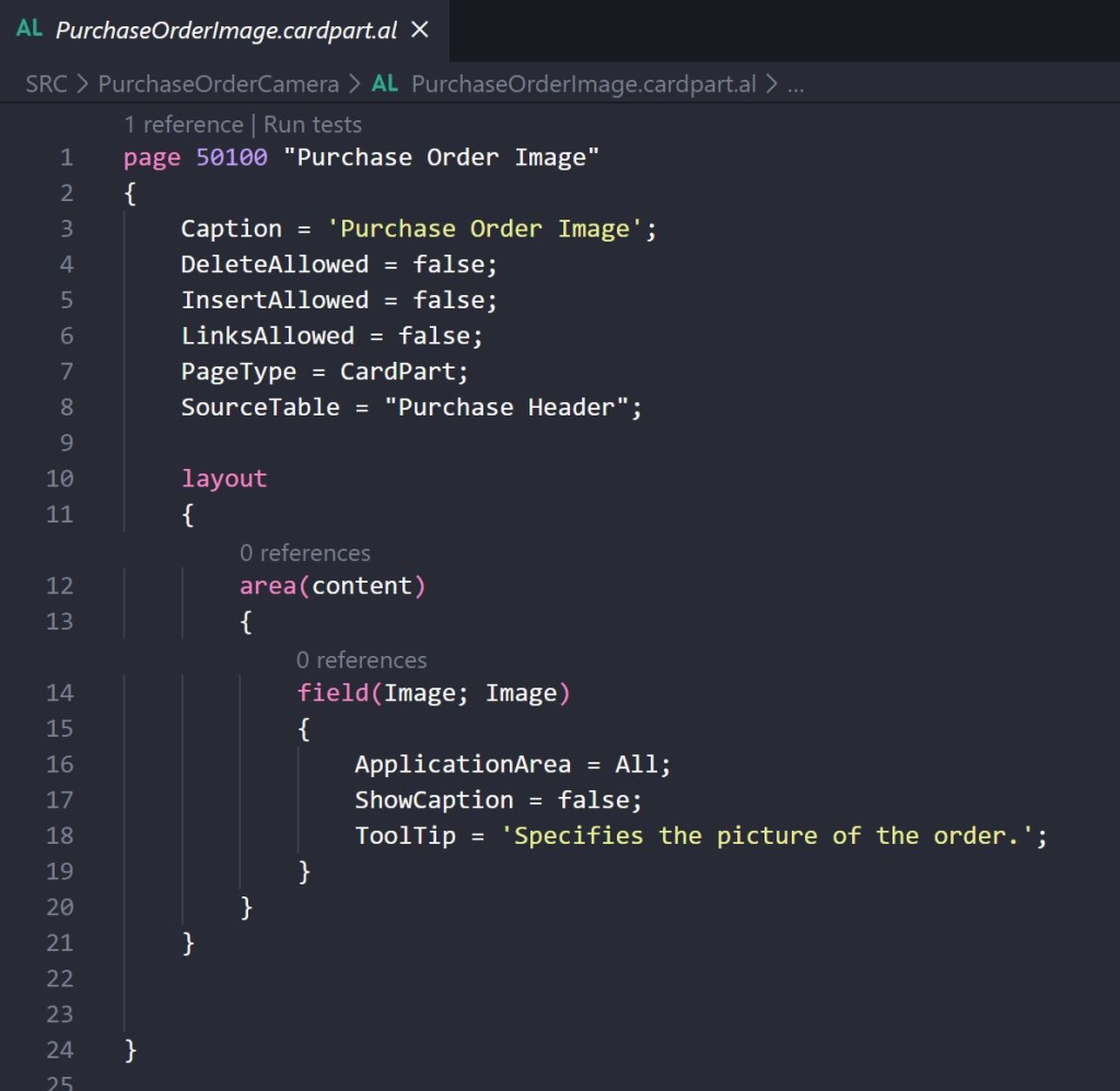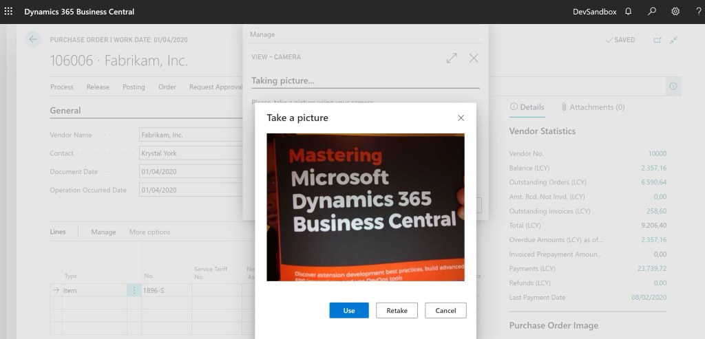 When the picture is taken, it’s saved on a Media field and it’s displayed on the Purchase Order page (in a cardpart object):