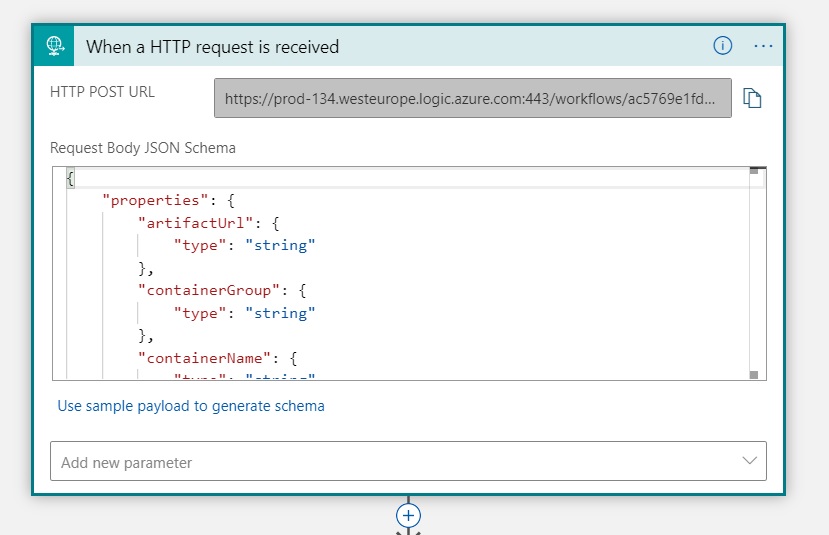 To handle this scenario, I will create an HTTP-triggered Azure Logic App. This Logic App will receive a JSON object that contains the parameters for defining the Dynamics 365 Business Central Docker container to create, like the following: