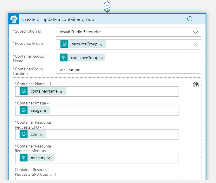 When the HTTP request is received (with the above JSON body) from the Logic App endpoint, a new Create or update a container group action is triggered. This action receives the parameter from the body and must be configured in order to be able to create the Dynamics 365 Business Central container. The configuration is quite tricky and here I want to explain the parameters that must be configured to successfully create a Dynamics 365 Business Centra ACI container.