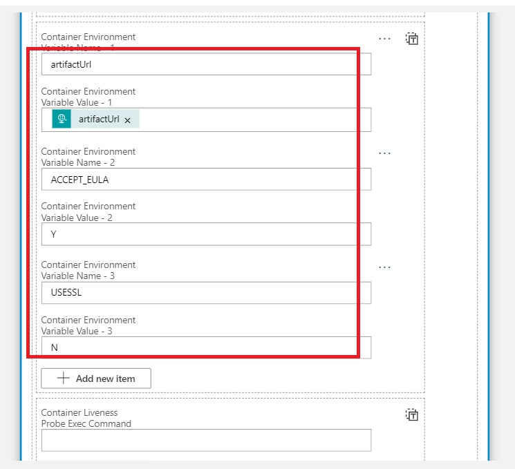 Then, the other required parameters that must be configured are the environment variables required for the creation of a Dynamics 365 Business Central container: