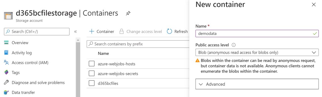 In this way, your container will have anonymous access for reading the blob content. In this way, you can avoid to share access keys for loading demo data (obviously, this is up to you if you don’t want this but instead you prefer to add an access key).