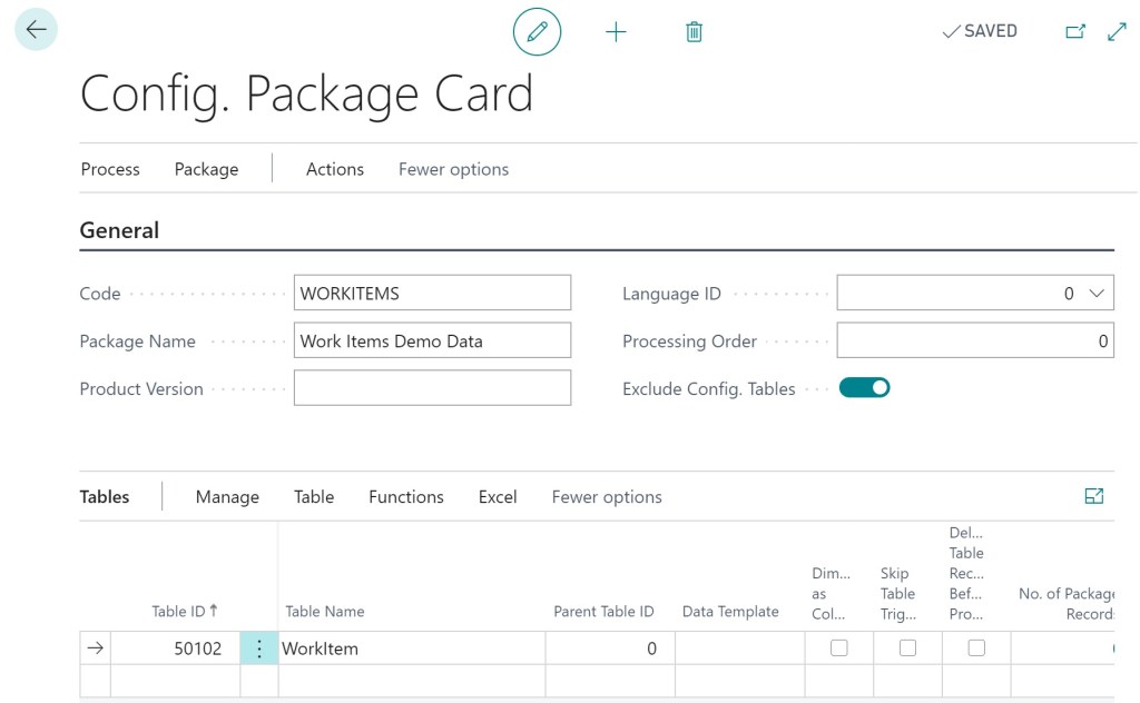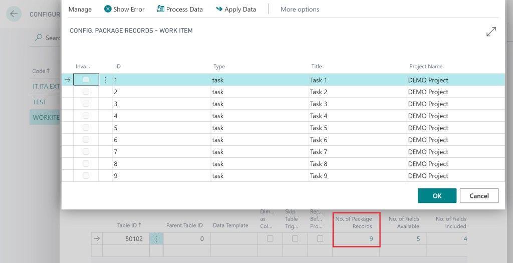 When the container is created, you can create a new Configuration Package. Here as a demo I’m using an extension that has a table called WorkItem: