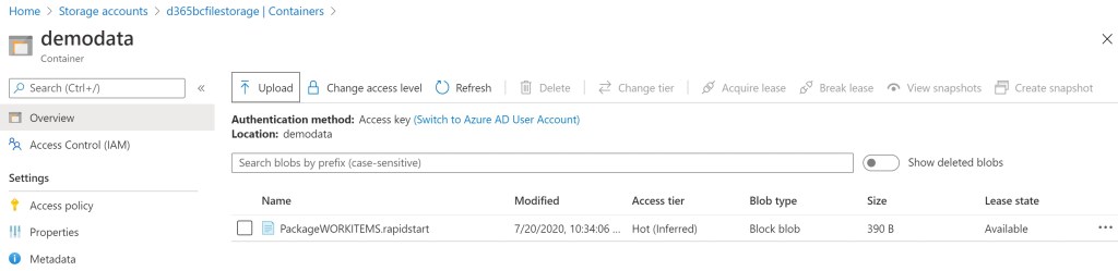 Here I have 9 demo records. Then, export the package with your data as a .rapidstart file and then upload this file to your Azure Blob Storage container: