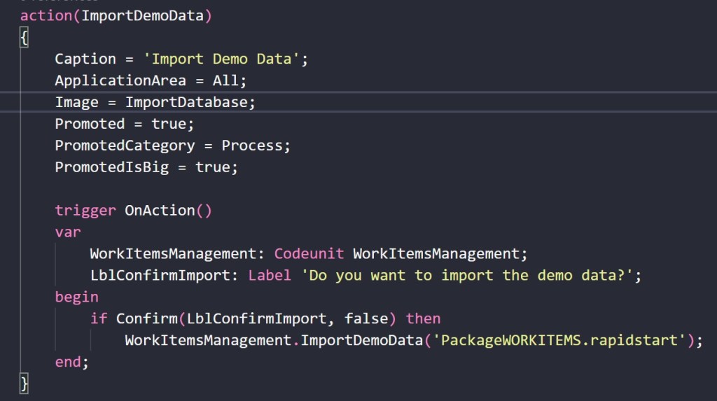 Now the code part. On my extension, I create an Import Demo Data action for loading the demo data from the Rapidstart package (but you can trigger it also automatically from your code):
