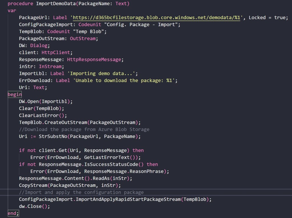 I think it’s quite self-explanatory. By using the HttpClient object it downloads the package from the storage account to a stream and then it calls the ImportAndApplyRapidStartPackageStream method of the Config. Package – Import codeunit for loading and applying the package to the database.