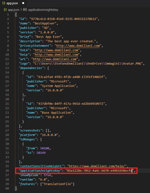 With Dynamics 365 Business Central version 17 you (as a partner or ISV) will be able to add your Application Insights Instrumentation Key to an extension for sending custom signals from AL code to your Application Insights instance. This could be done by adding the new applicationInsightsKey parameter in the extension’s app.json file: