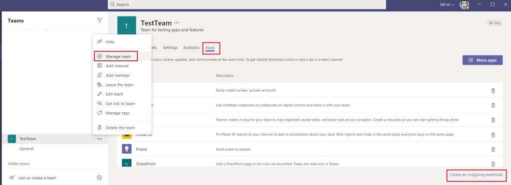 Now, open Teams, go to your channel, select Manage Teams, click on Apps and then select the Create an outgoing webhook link at the bottom of the screen: