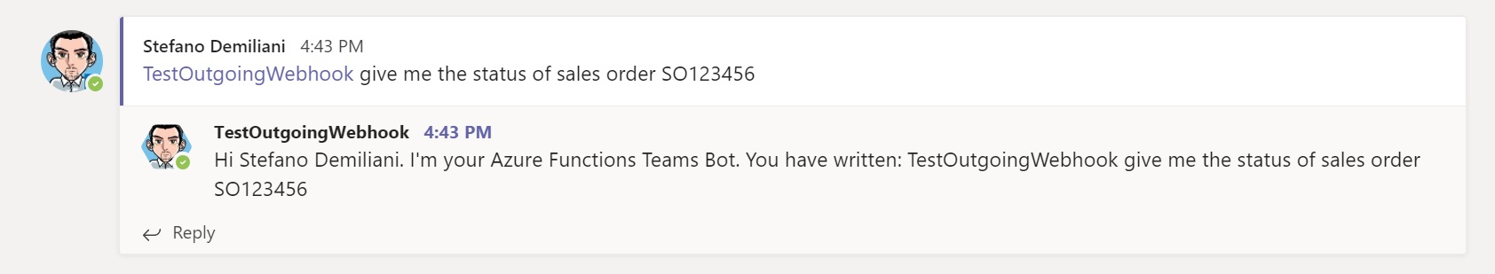 What happens now on our Teams channel? We have a new bot that we can call simply by using a mention like @TestOutgoingWebhook: