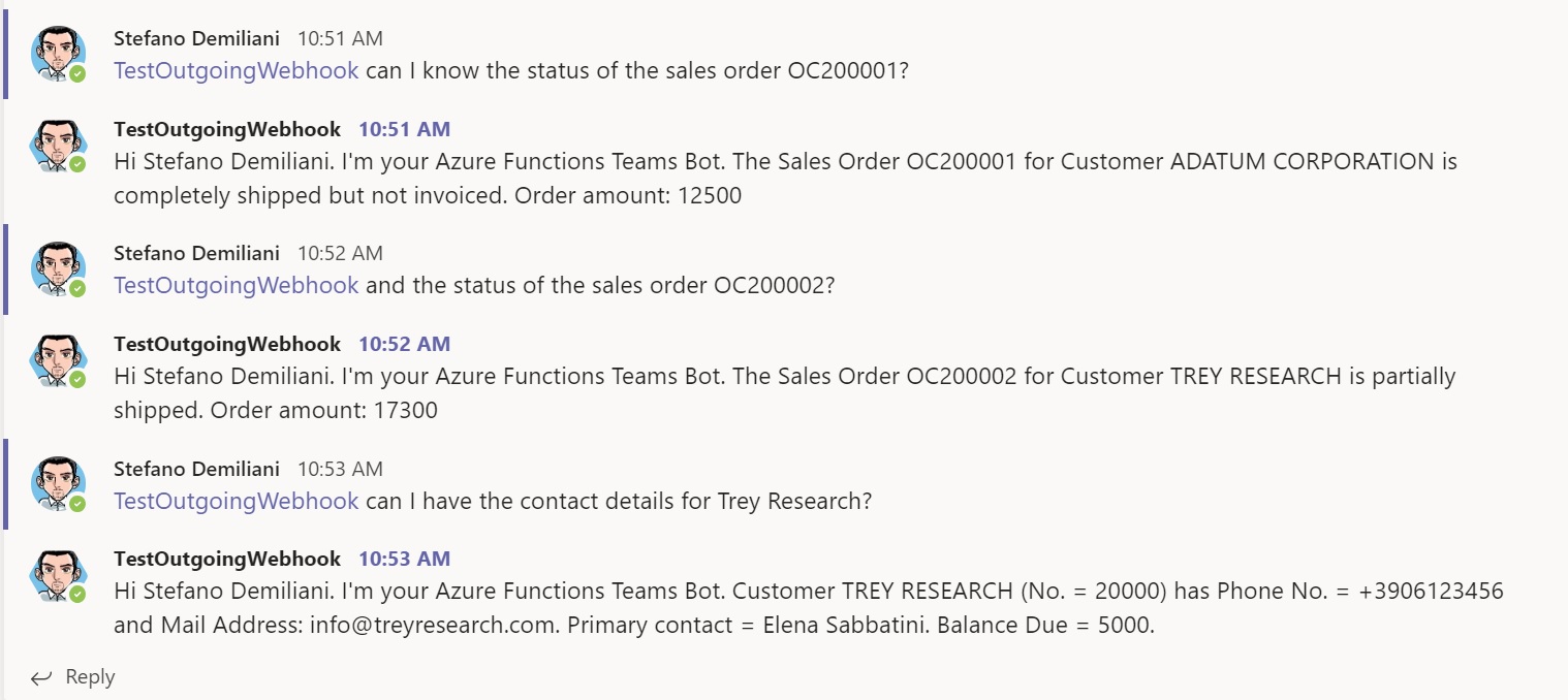 As said before, you can do more than this. A tipical example is to parse the text message for keywords and then for example calling the Dynamics 365 Business Central APIs for retrieving data. You can then send back responses for your users in text format but also in more complex formats like adaptive cards. But why I love this approach too? Because you can have a set of Azure Functions that handles your integrations (with Dynamics 365 Business Central or with other third-party apps) and these functions can be completely aware of the caller (Teams or other apps). Just create a single function that handles the in and out messages with Teams and your logic for integrating the external apps will be untouched (no integration logic inside the bot).