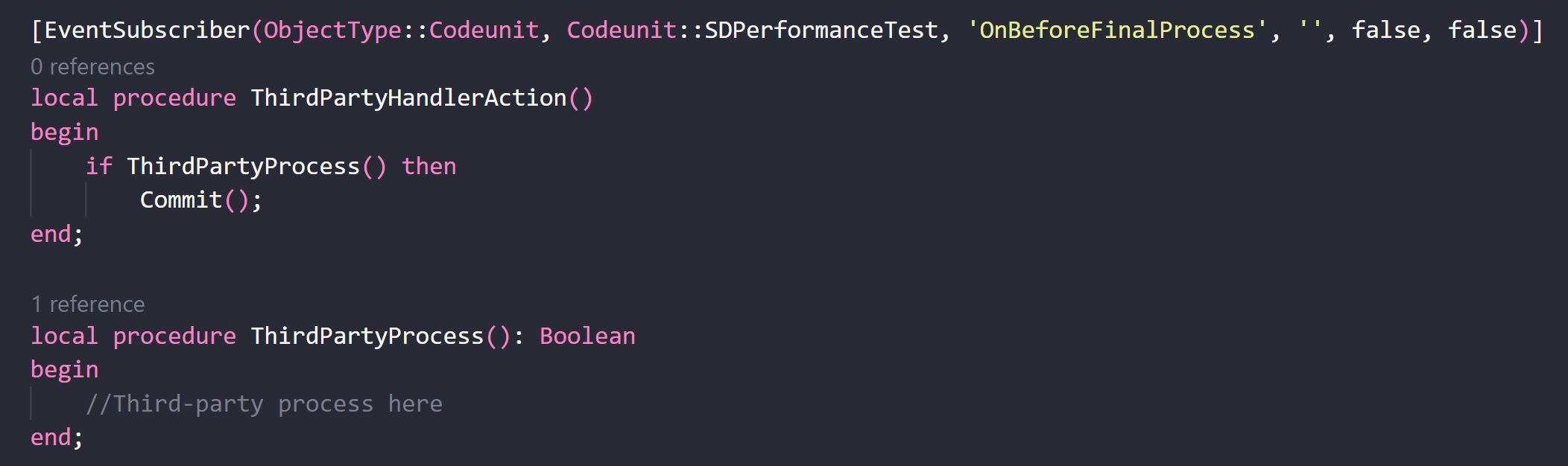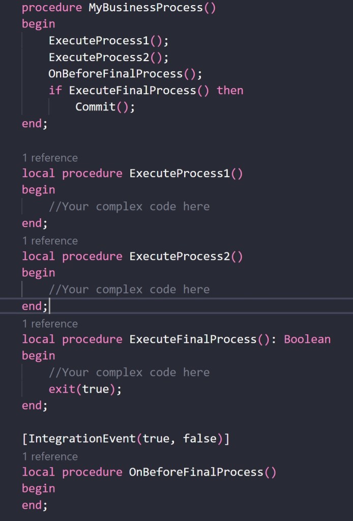 Here the business process is composed of 3 steps (ExecuteProcess1, ExecuteProcess2 and ExecuteFinalProcess procedures). Before calling the ExecuteFinalProcess procedure, we raise an integration event for our subscribers (third-party extension’s integration) and ONLY if the ExecuteFinalProcess procedure returns TRUE, the transaction is committed.