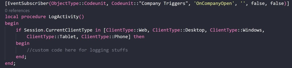 This extension subscribes the OnCompanyOpen trigger and then adds a custom code for logging stuffs related to the user on custom tables. Please don’t do in this way if you need that!