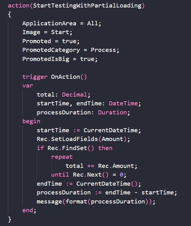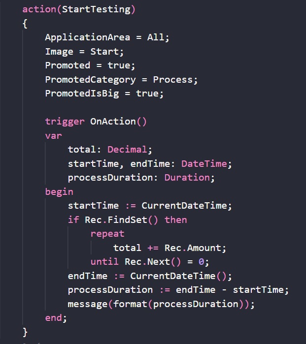 This code uses FINDSET to loop through all records and calculating the total amount, then it prompts the duration of the calculation.