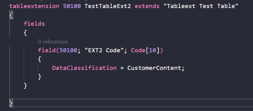 The 6 other dependent extensions that I’ve created are all similar and simply they define a new tableextension object for adding a new custom field on the Tableext Test Table table previously defined in the main extension. The code of these 6 extensions is simply the following: