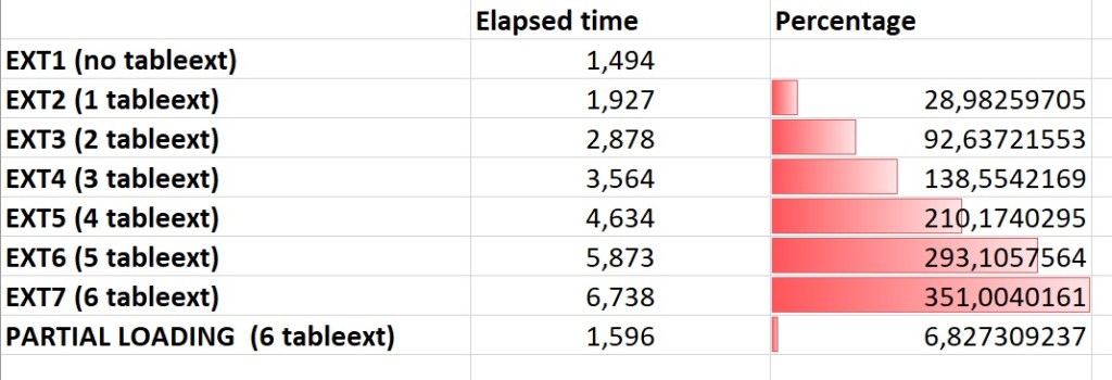 A simple tableextension of an heavy table can affect your code performances for about 20%. With 6 tableextensions of the same heavy table, your code performances can be affected by 300% and more.