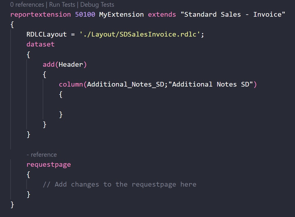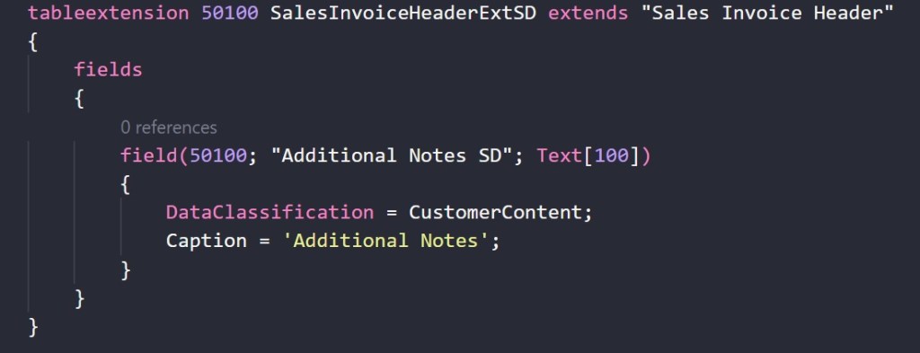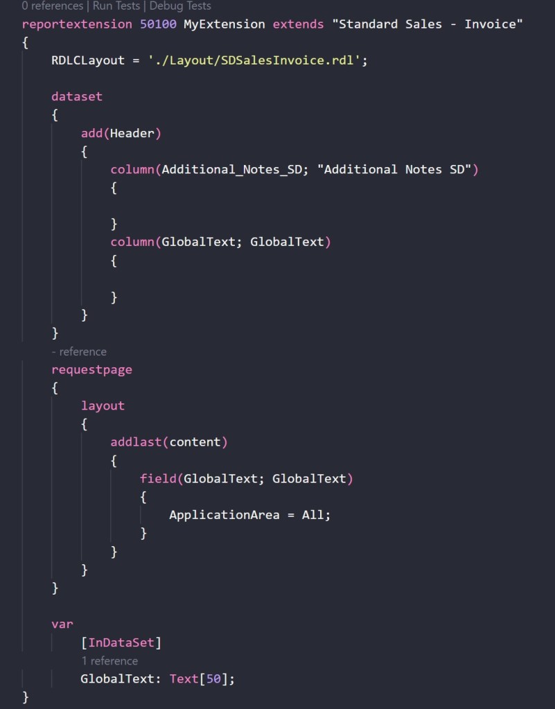 As a simple example on how to use this new object, imagine that I want to extend the “Standard Sales – Invoice” report because I need to print a custom field “Additional Notes SD” defined in the Sales Invoice Header table: