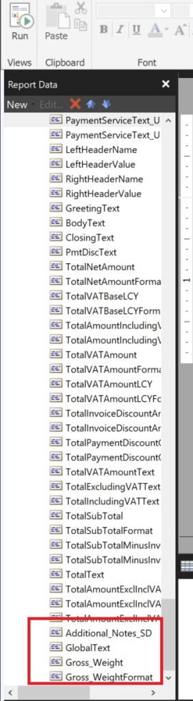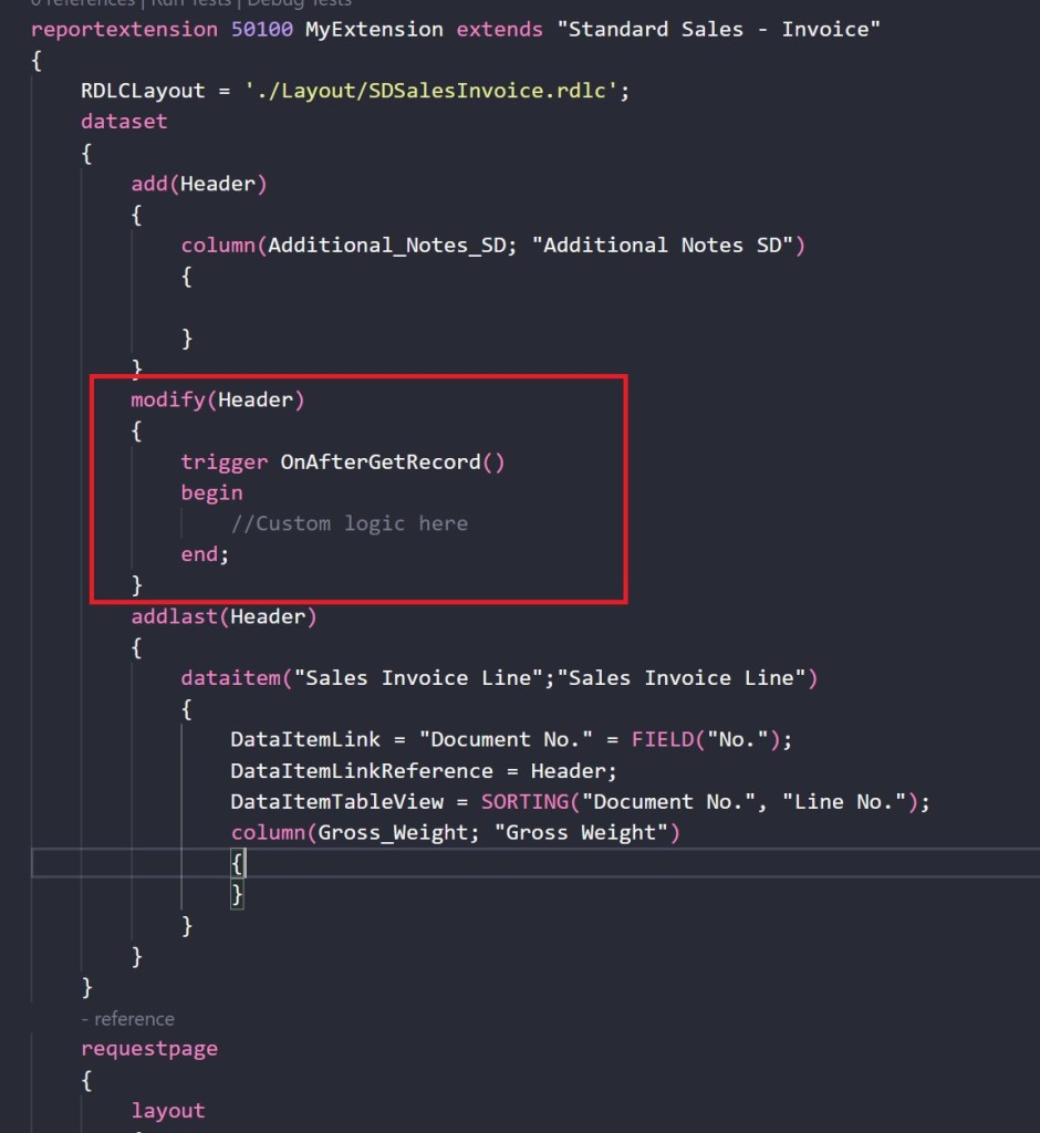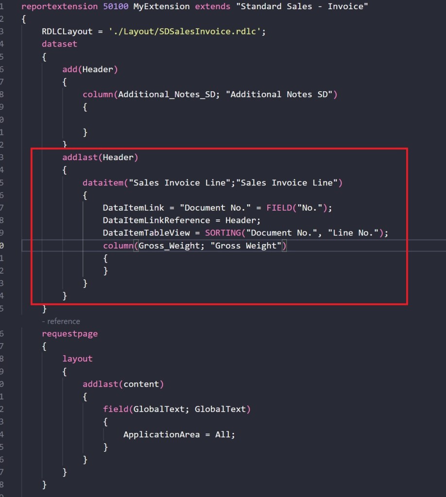Here I’m adding to the report’s dataitem called Header (in the standard AL dataset definition) the new custom field previously defined. You can also add global report’s fields to the request page and to the dataset, like for example: