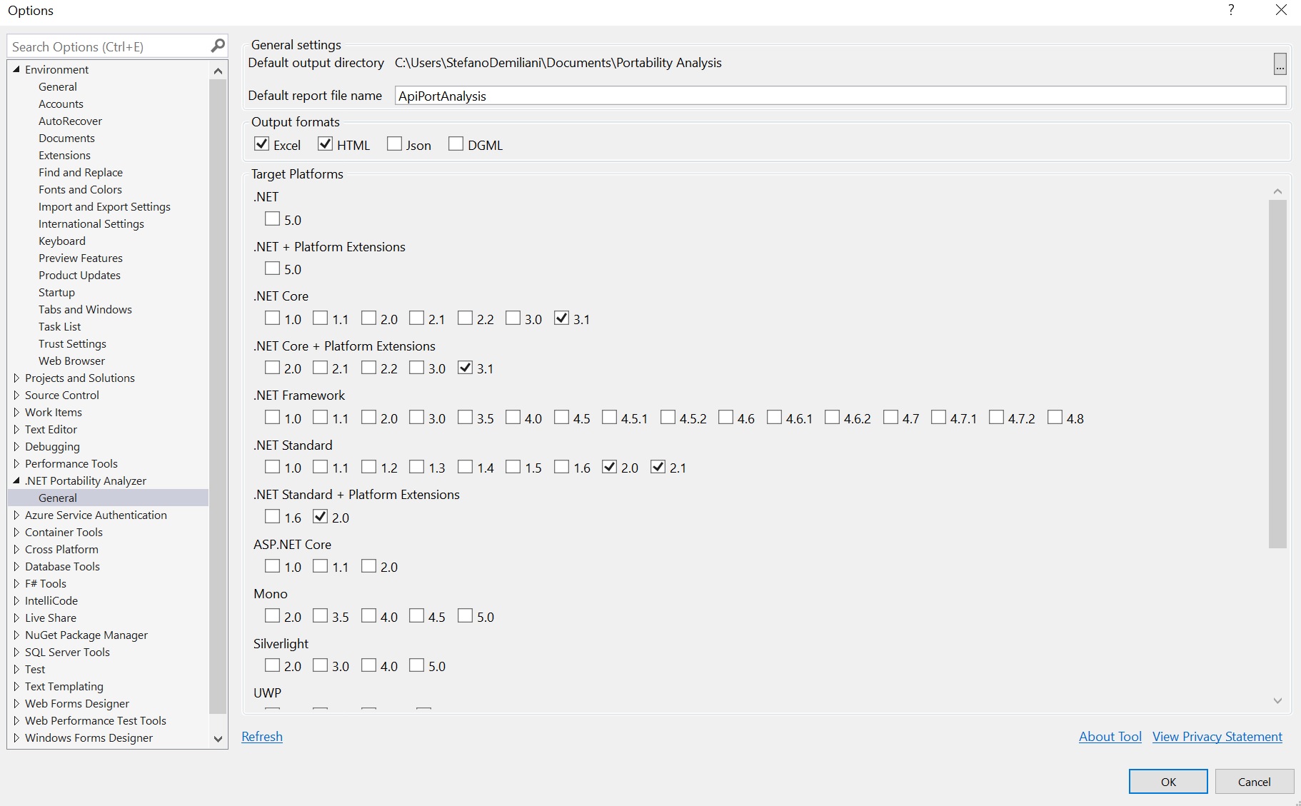 Here I’m selecting .NET Standard 2.0 and .NET Core 3.1 versions and I’m specifying that I want a final report in HTML and Excel format. When you’ve defined your settings, click OK.