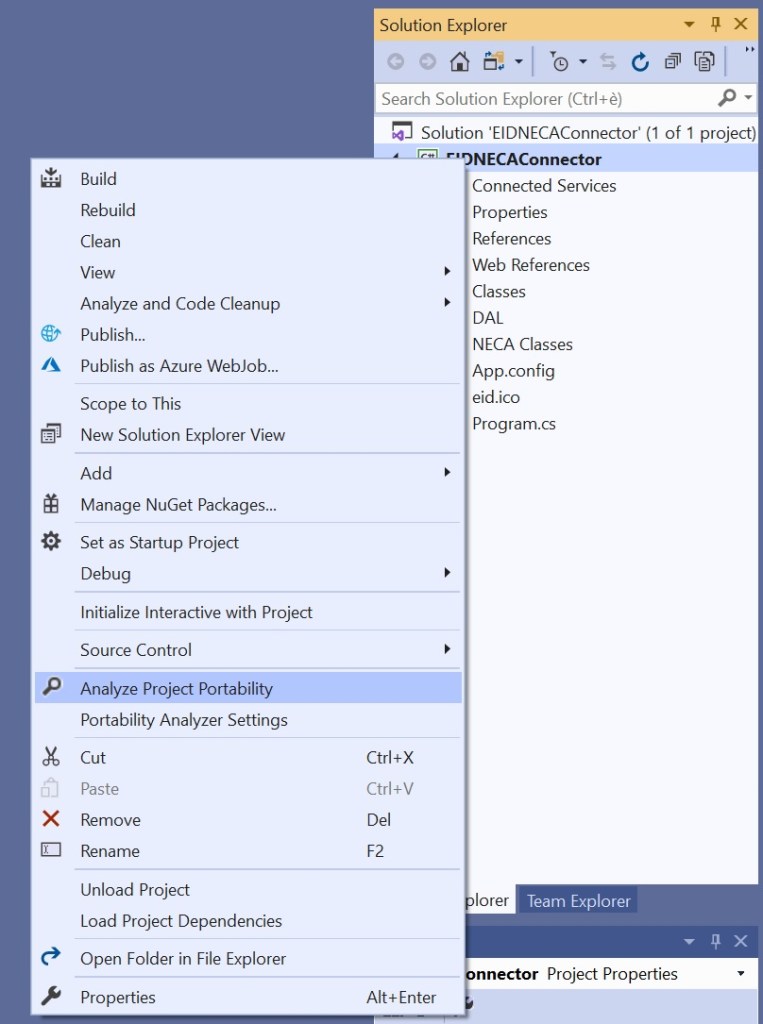 Now right click the project that you want to analyze and select Analyze Project Portability: