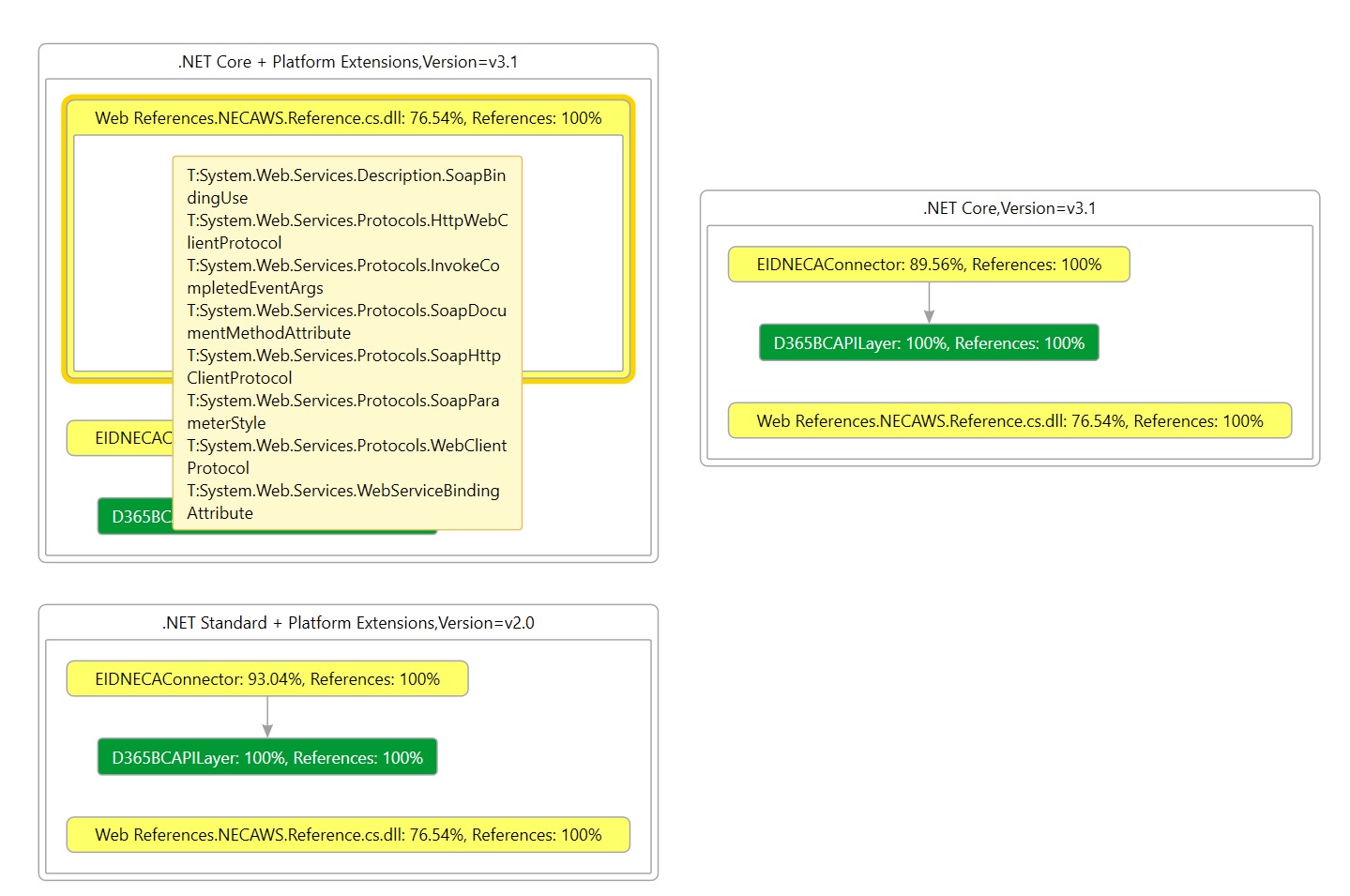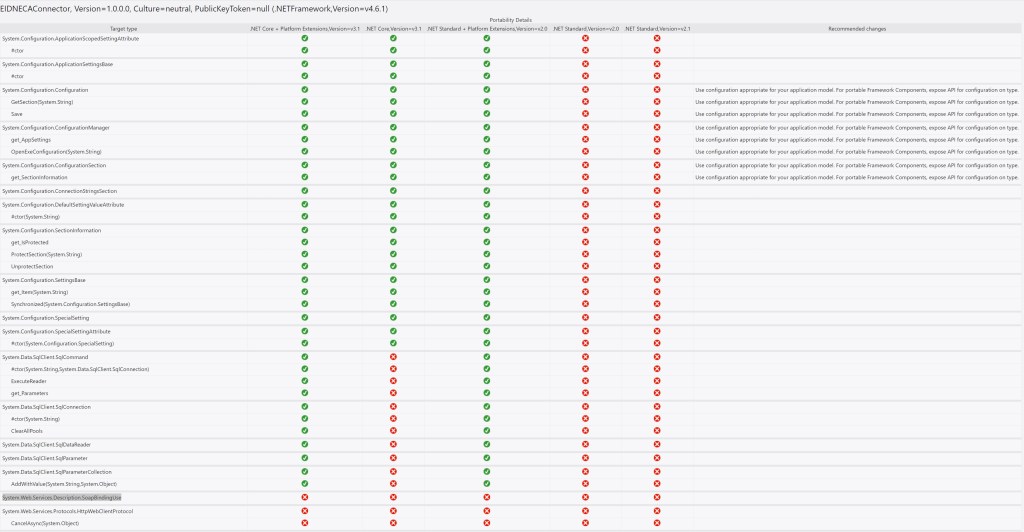 As you can see here, my add-in solution has two libraries. The D365BCAPILayer library is 100% compliant with .NET standard rules, while EIDNECAConnector library ha some problems (93% compliant) due to SOAP usage. You can also click and see the details: