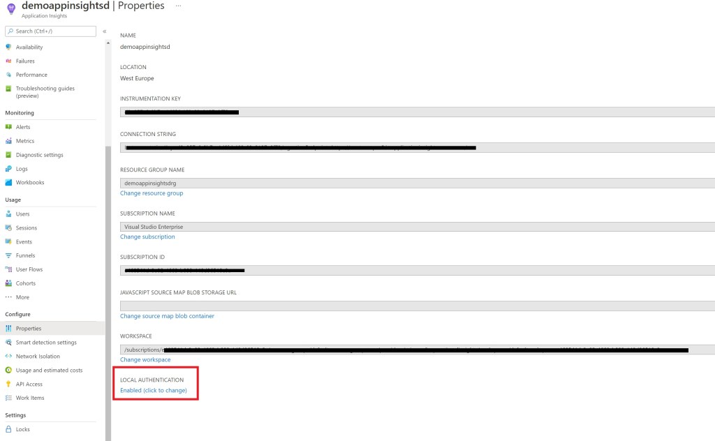 When you create an Azure Application Insights instance, it has local authentication enabled as default: