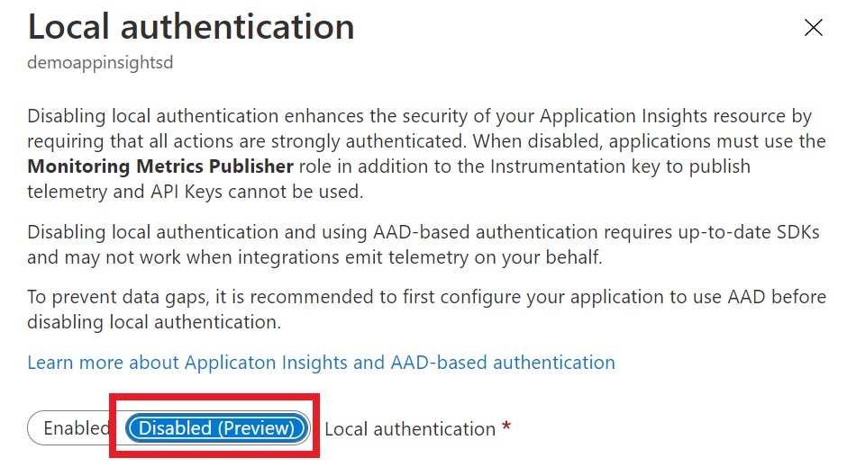 By using this new feature you can now choose to opt-out of local authentication and ensure that only telemetry that is exclusively authenticated using Managed Identities and Azure Active Directory is ingested in your Application Insights resource.