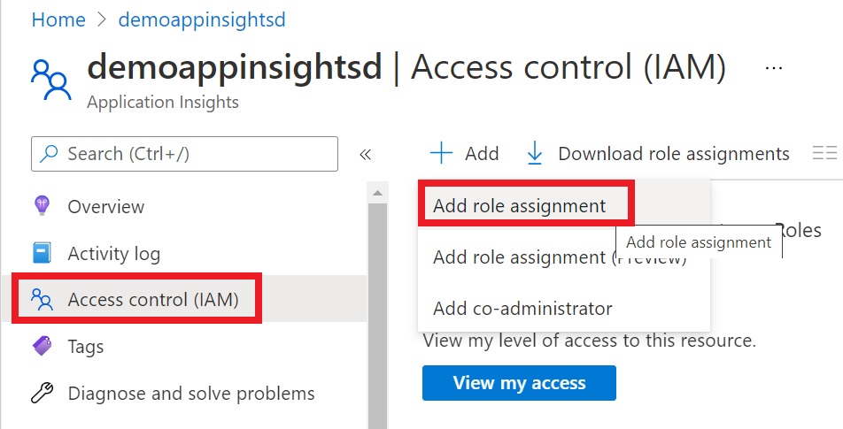 To enable the managed identity to access the Application Insights instance, select Access Control (IAM) and then add a role assignment: