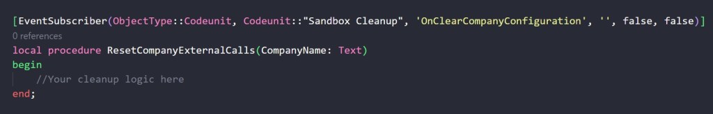 • OnClearCompanyConfiguration: subscribe to this event to clean up company-specific data when copying to a sandbox environment.