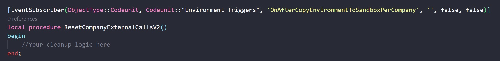 • OnClearCompanyConfiguration: subscribe to this event to clean up company-specific data when copying to a sandbox environment.