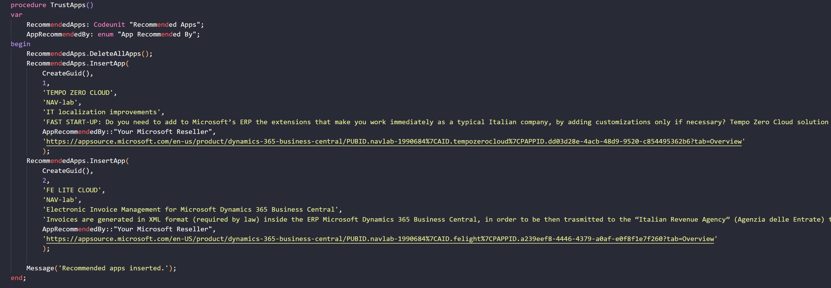 “Recommended Apps”(CodeUnit 4750).InsertApp line 3 – Recommended Apps by Microsoft