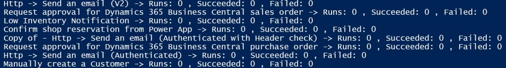 Write-Host "$displayName -> Runs: $todayRunsCount , Succeeded: $todaySuccessRunsCount , Failed: $todayFailedRunsCount"