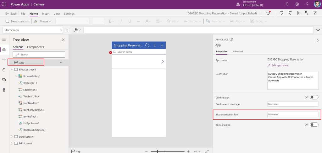 In the Power Apps editor select the App object from the left navigation tree view and on the App Object properties paste the Azure Application Insights Instrumentation Key (that you can retrieve from the Azure Portal) into the Instrumentation Key property box: