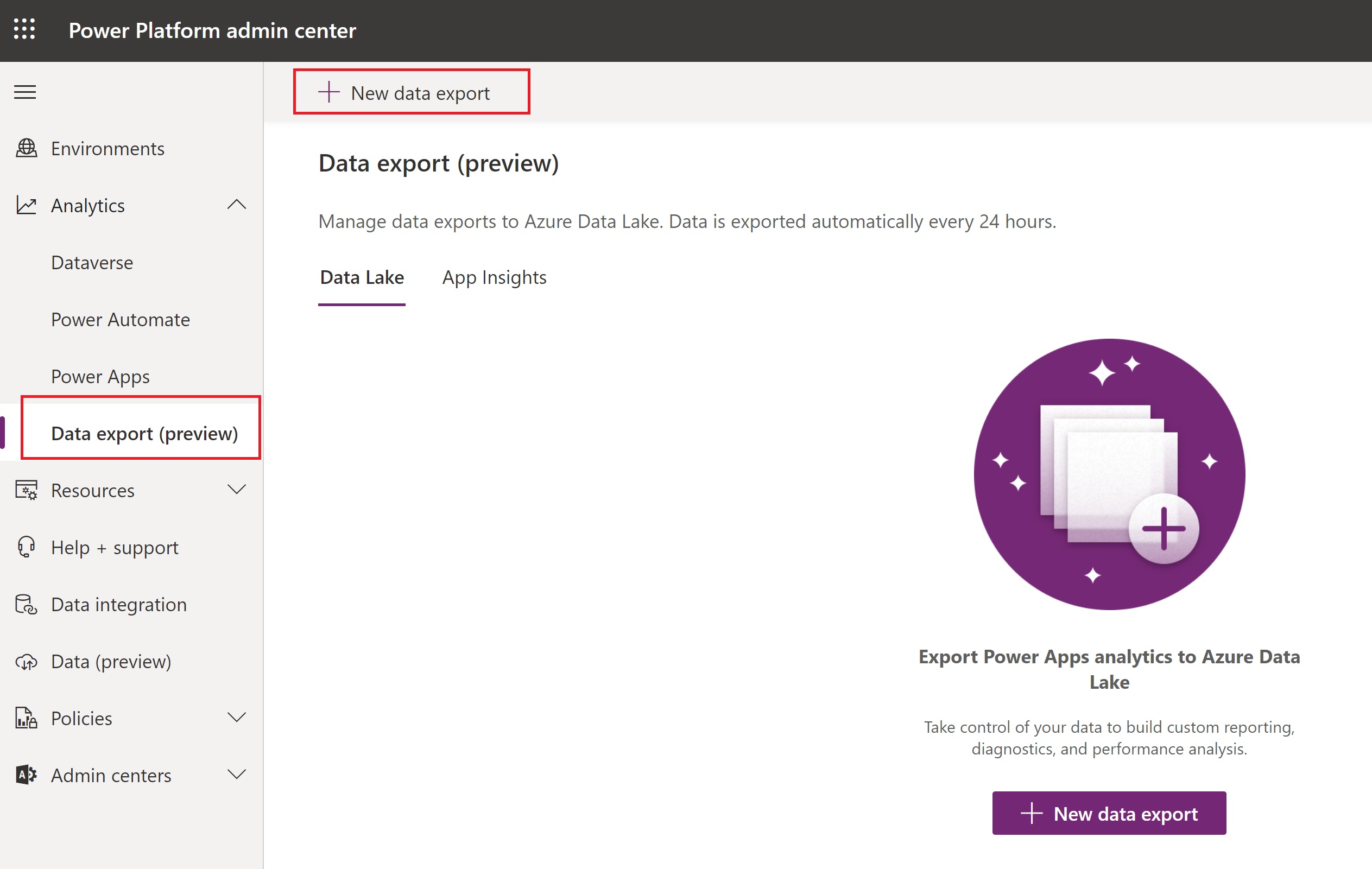 To do that, log on to Power Platform Admin Center (https://admin.powerplatform.microsoft.com/) with a Global Admin or Power Platform Admin account and under the Analytics option select Data export (preview), then click on New data export: