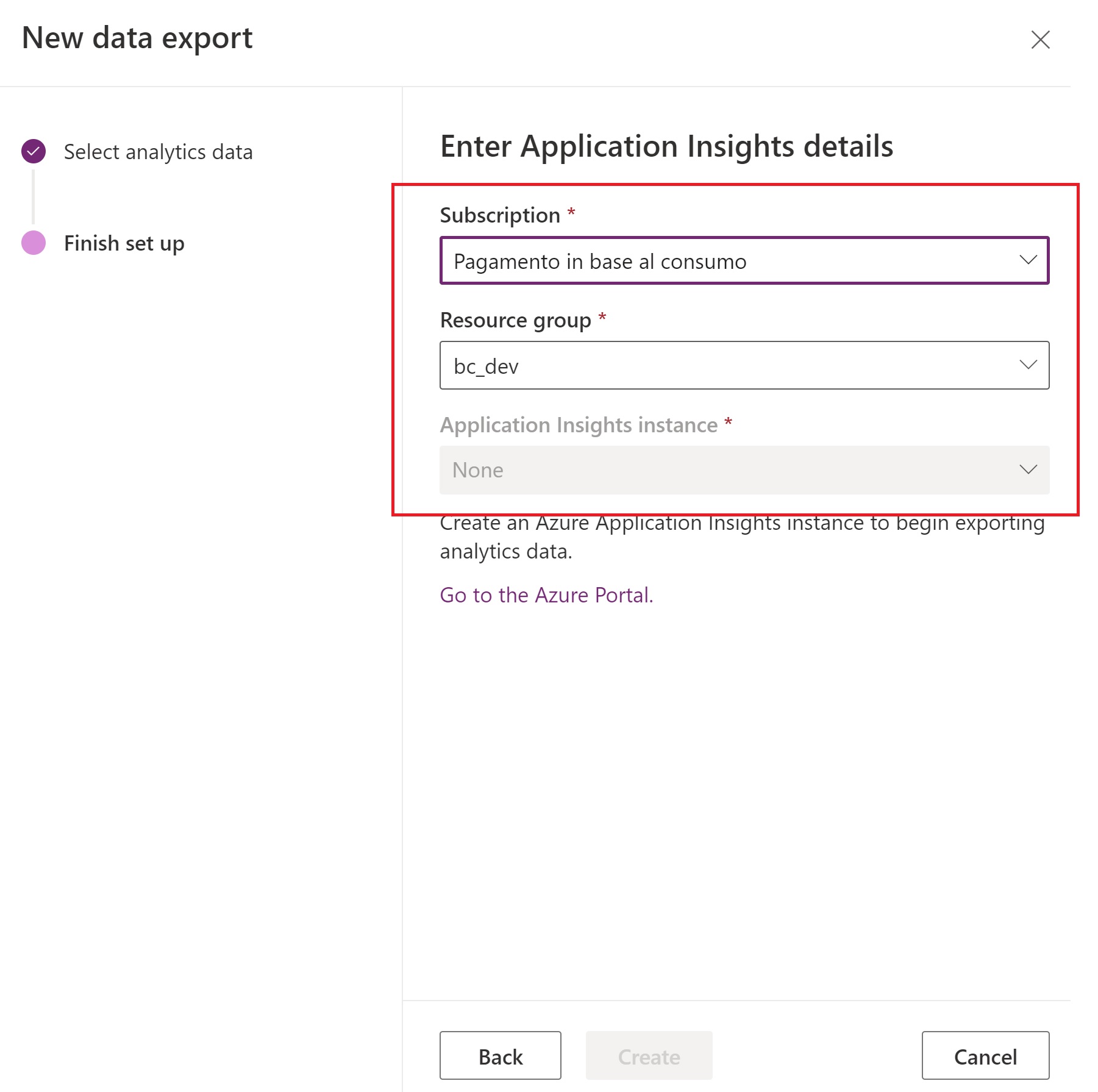 In the New data export window, select CDS diagnostics and performance under the Export to Application Insights section and select the Dataverse environment to connect: