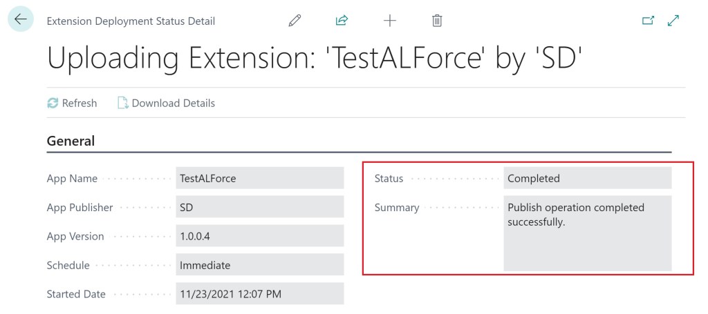 This extension is on version 1.0.0.2 and it’s deployed as a per-tenant extension (PTE scope) on my SaaS sandbox environment. All good.