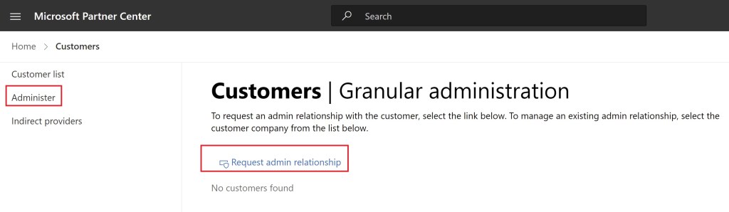 To set-up a Granular Delegated Admin relationship with a Customer, you need to access your Partner Center account and select the Customers section. Here click on Administer and then on Request admin relationship: