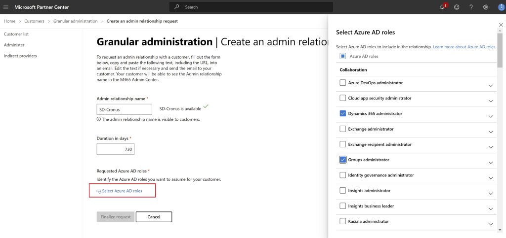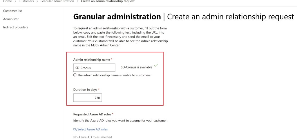 Here you need to provide an Admin relationship name that must be unique in your tenant and the duration can be maximum 730 days (2 years) but you can obviously restrict it accordingly to your contract: