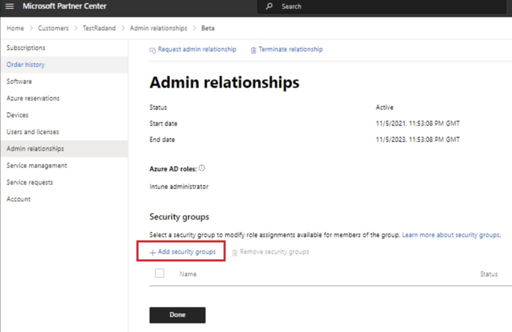 Here you can select your established GDAP relationship and click on Add Security Group for modifying the role assignments available for the members: