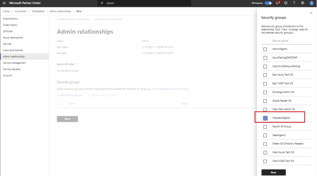 this is where you can select the security groups that you want to grant permissions to the GDAP relationship (fo example, the HelpdeskAgents group):