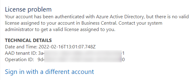 "Your account has been authenticated with Azure Active Directory, but there is no valid license assigned to your account in Business Central."