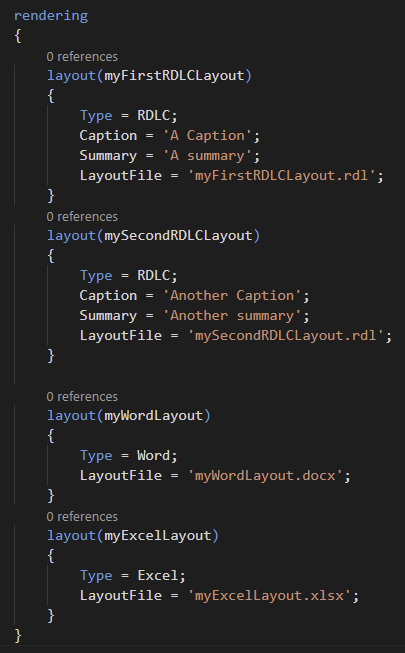 In this section you can add as many layouts you want, and those layouts can be RDLC, Word, Excel and Custom. For custom report layouts, a MimeType must be provided and you can define custom renderer (a new ReportManagement.OnCustomDocumentMerger event is available for that).