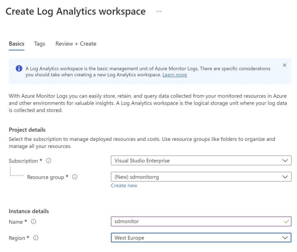 Now you can start ingesting data from your Azure resources into this monitoring workspace and you can create an Azure Application Insights resource linked to this workspace (Application Insights is a feature of Azure Monitor that provides extensible application performance management (APM) and monitoring for live cloud applications).