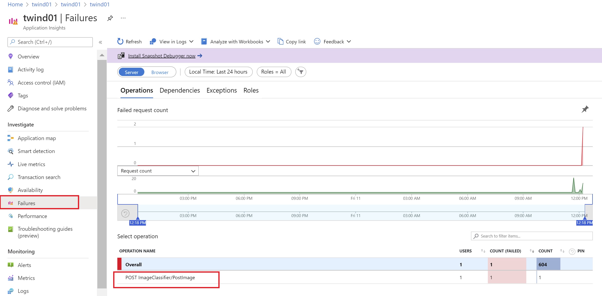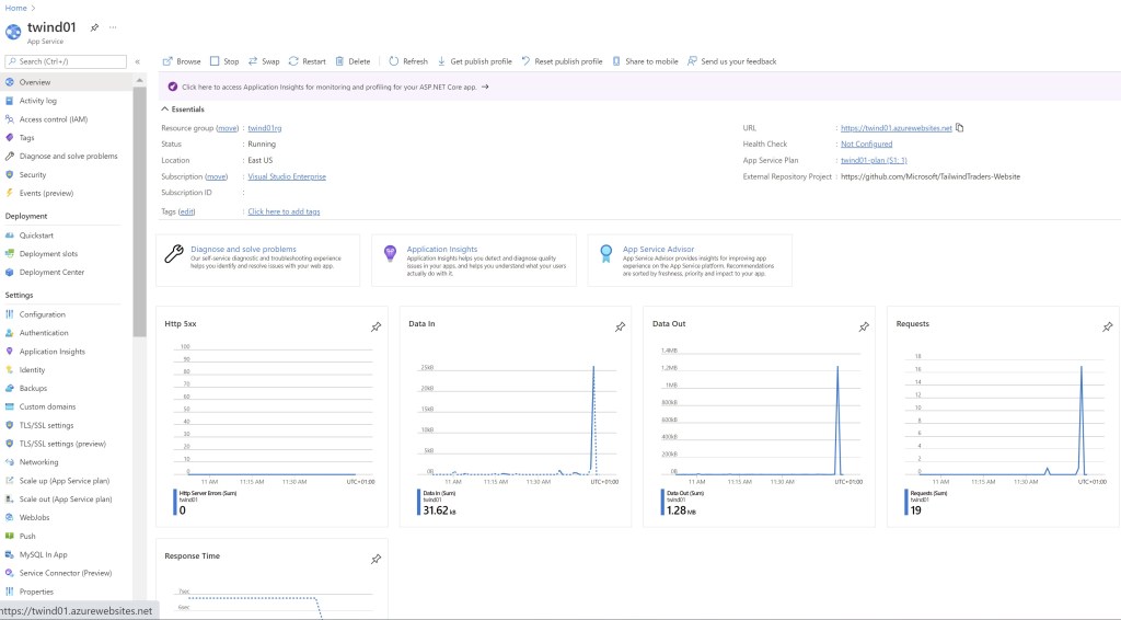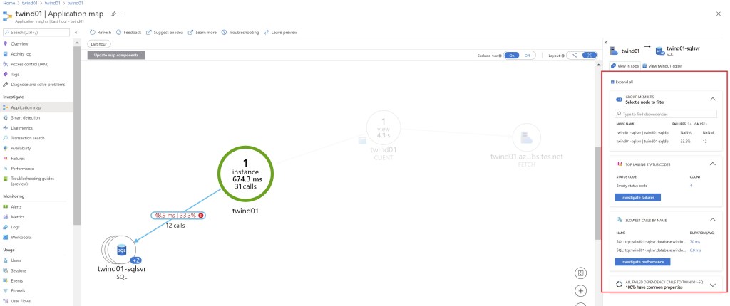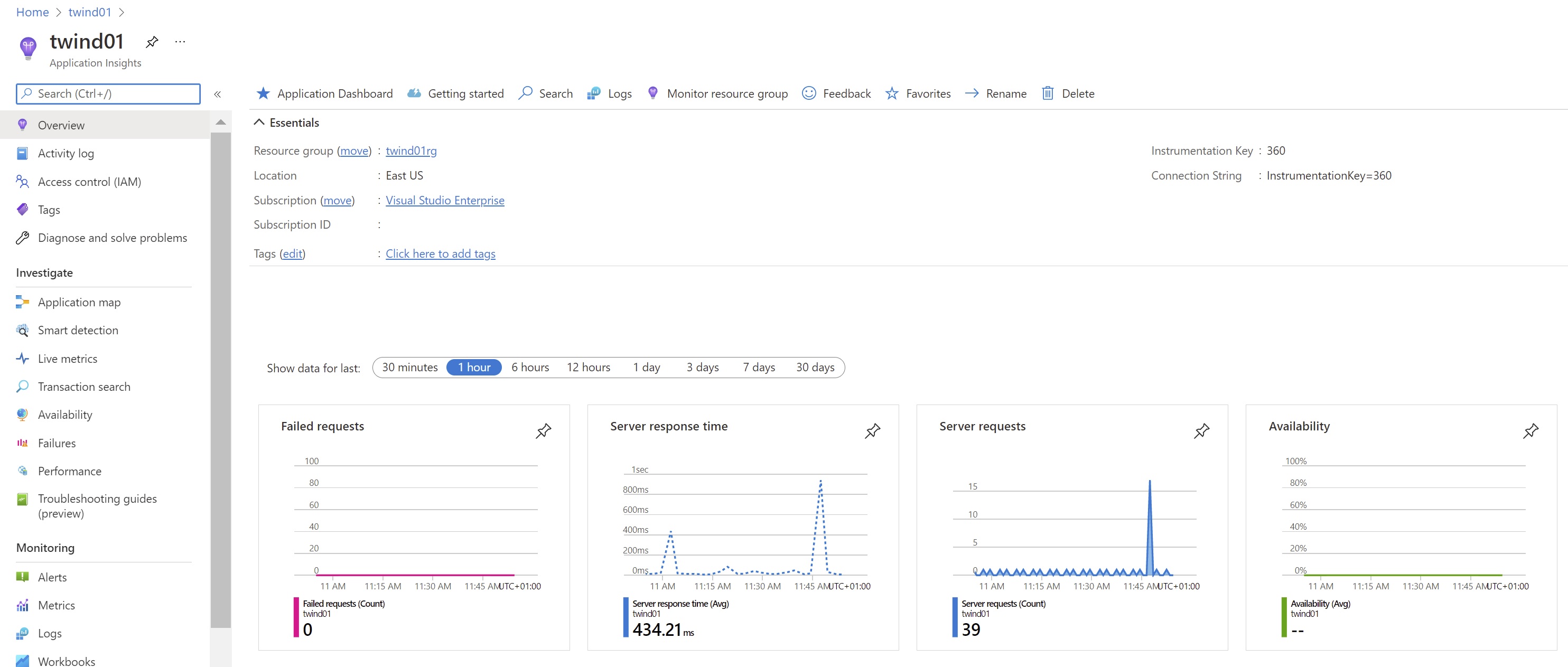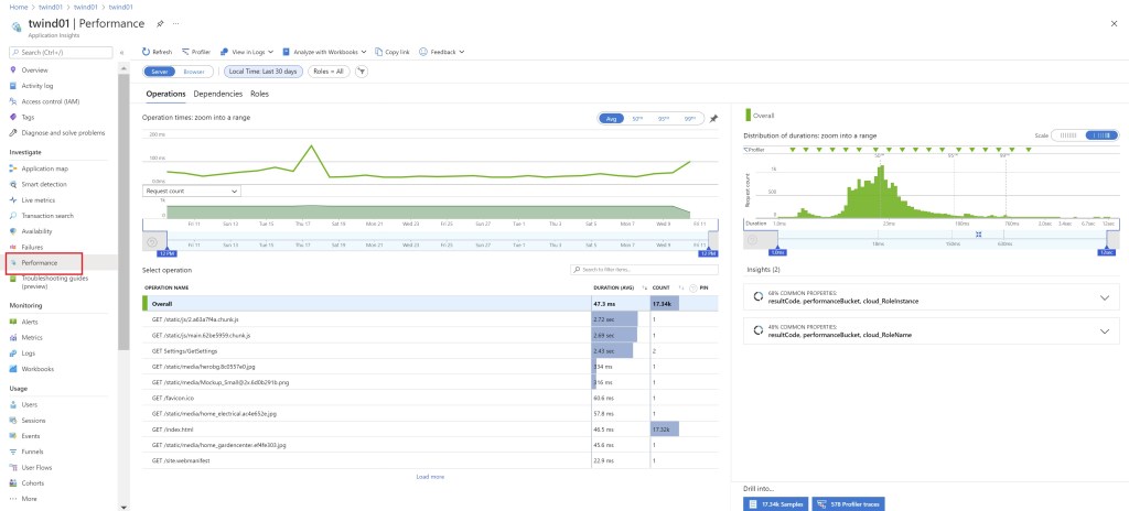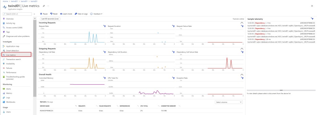 The twind01 App Service instance is connected to an Azure Application Insights instance (always called twind01) where the website telemetry is collected: