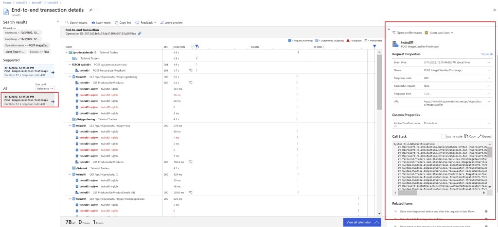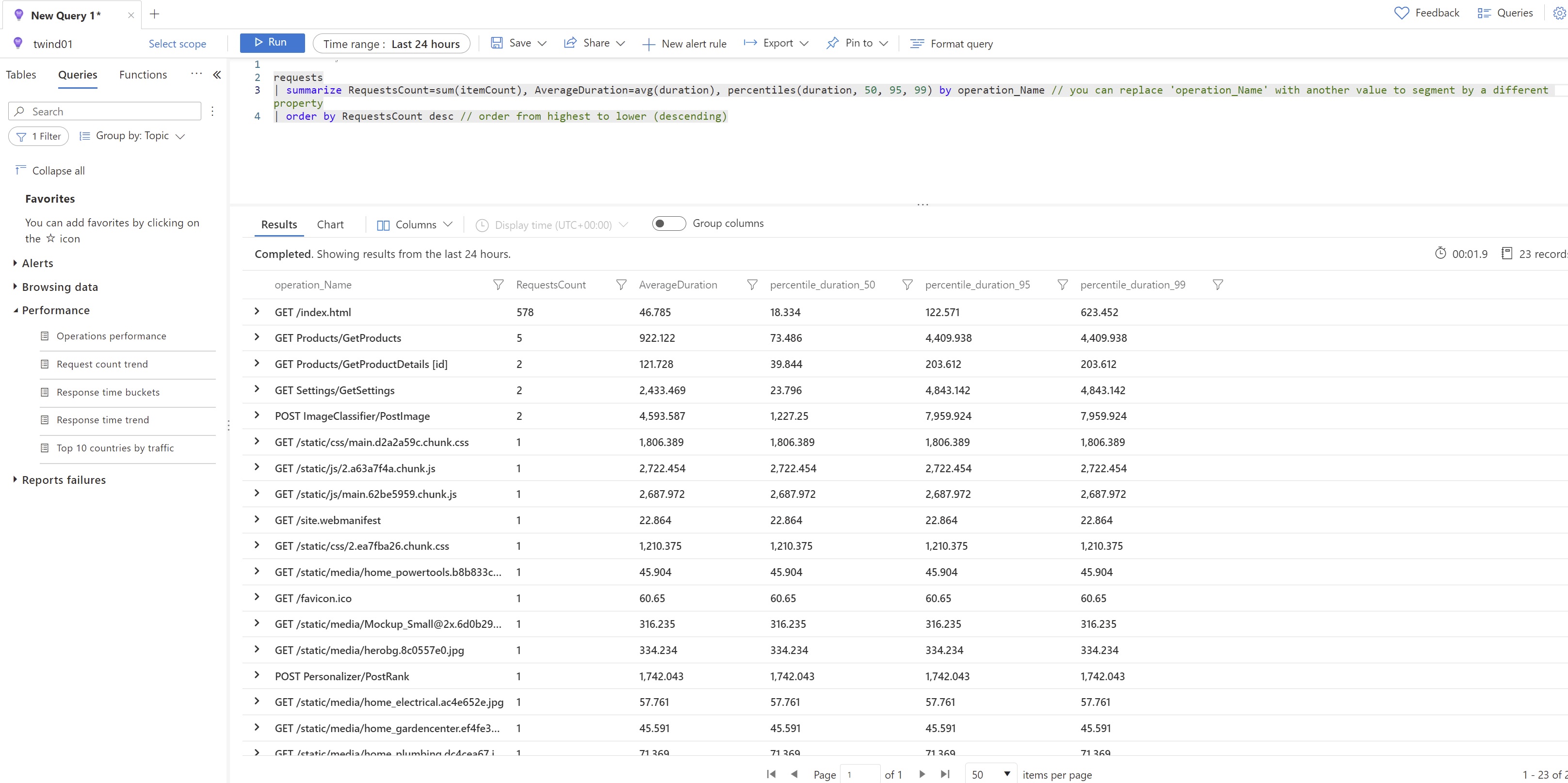 From the twind01 Application Insights instance, we can monitor different aspects of our B2B application. We can monitor the response time of the different interactions with the website with the details of the incoming calls: