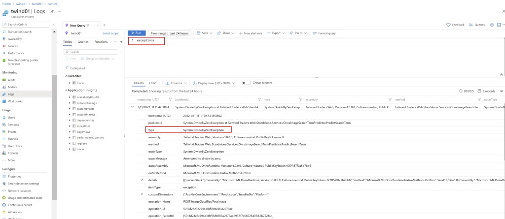 We can also open Log Analytics and perform KQL queries inside our telemetry store in order to inspect the entire telemetry. For example, If I want to inspect exceptions, we can do something like the following: